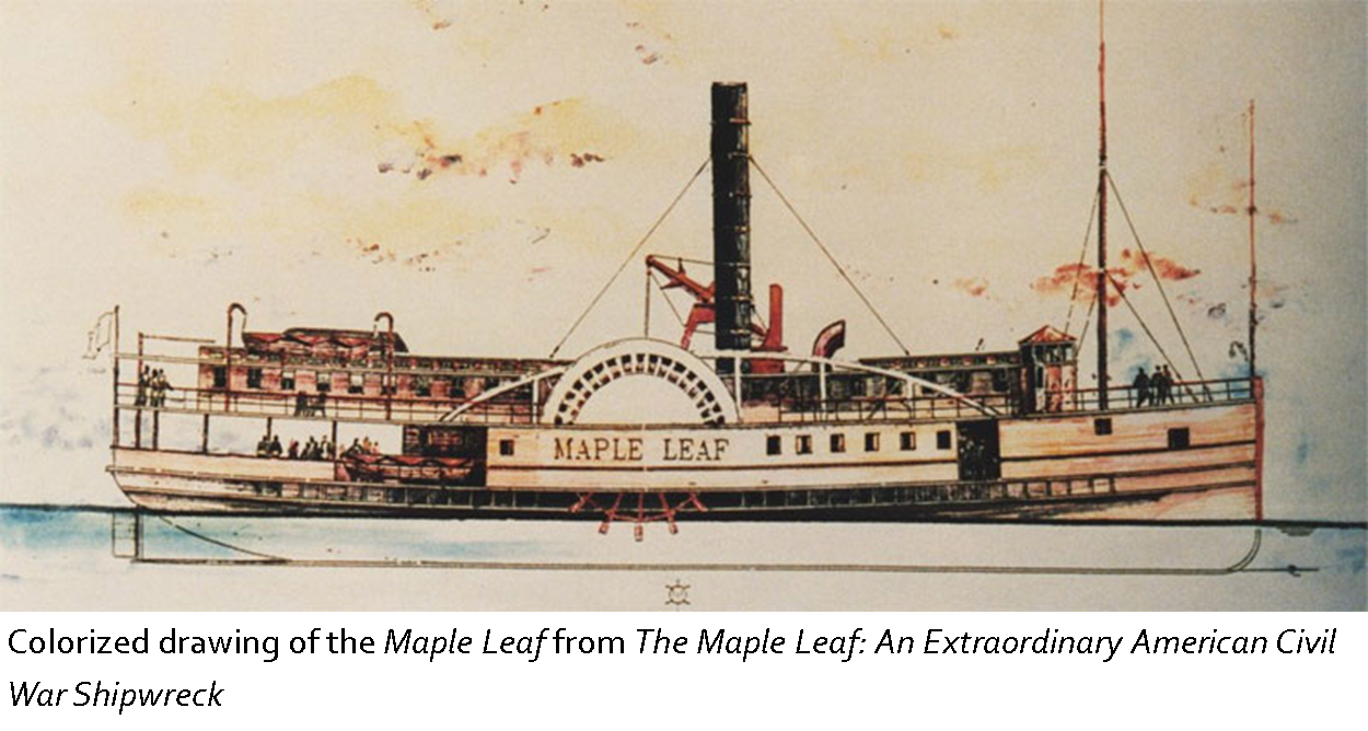 1864 - The Federal transport steamer, Maple Leaf, struck a Confederate torpedo, now referred to as a mine, on the St. Johns River near Mandarin and sank immediately in three fathoms of water on this date. A detachment of Confederate artillery and a company of infantry troops were dispatched to the area to ensure that the wreckage was complete. The 181-ft long Maple Leaf was launched in 1851 in Ontario and was originally used as a freight and passenger vessel. It was leased to the U.S. Army in 1862 an used along the east coast as a military transport. The explosion ripped through the bow of the ship and killed four soldiers as the ship quickly sank. By 1882 the wreckage was still visible above the water and became a hazard to navigation so the U.S. Army Corp of Engineers removed the upper decks and the rest of the hull was subsequently covered in 20 feet of mud, effectively preserving the many supplies inside. In 1984 the wreck was rediscovered and in 1988/89, archeologists dove into the sunken vessel and recovered almost 3,000 artifacts, many of which are on display at the Jacksonville Museum of Science and History.