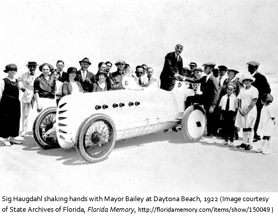 1922 – Sigurd Olson “Sig” Haugdahl broke the land speed record at Daytona Beach on this date. Sig reached a speed of 180 miles per hour in a car he built named the “Wisconsin Special.” The car had an 836 cubic inch, 6 cylinder airplane engine capable of producing 250 horsepower. Although Sig’s world record breaking run was widely publicized and was recorded, the American Automobile Association did not recognize the new record because they did not have any officials from their organization present at the time of the run, and Sig was not a member at the time. Haugdahl went on to help build one of the first road courses at Daytona Beach in the 1930s.