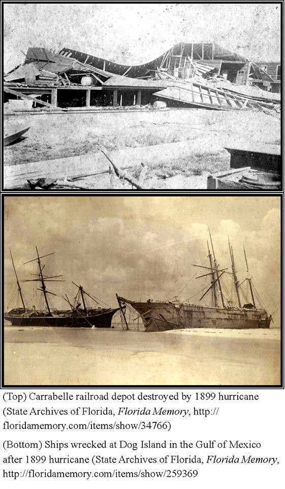 1899 – A powerful category 2 hurricane known as the 1899 Carrabelle hurricane made landfall near Apalachicola on this date. The storm was first observed near the Dominican Republic on July 28th, and then briefly made landfall over Islamorada before entering the Gulf of Mexico on July 30th. Damage in Florida’s panhandle was extensive. The city of Carrabelle was almost completely wiped from the map, at least 57 vessels were destroyed, and the small communities of Lanark, St. Teresa and McIntyre also suffered significant damage. Seven deaths were linked to the storm, and hundreds were injured. Monetary losses at Carrabelle alone were estimated at $100,000. This was only the second of five major storms that would impact Florida in 1899.