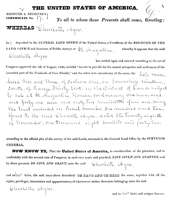 1842 - The Armed Occupation Act was passed by Congress on this date. Each settler who would settle and cultivate five acres or more of land in eastern and southern Florida for a period of five years would receive 160 acres of land and one year’s rations from the Federal government. Settlers were expected also to provide militia service, if needed, to control the activities of the warring Seminole Indians. This was the prelude to the official declaration of the end of the Second Seminole War on August 14, 1842.