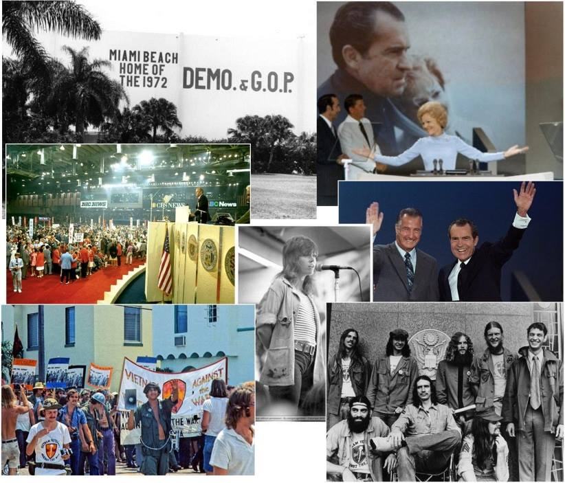 1972 - National Convention of the Republican Party of the United States was held from August 21 to August 23, 1972 at the Miami Beach Convention Center in Miami Beach, Florida. It nominated the incumbents Richard M. Nixon of California for President and Spiro T. Agnew of Maryland for Vice President. The convention was chaired by then-U.S. House Minority Leader and future Nixon successor Gerald Ford of Michigan. The convention was targeted for widespread protests, particularly against the Vietnam War, and the Nixon administration made efforts to suppress it. The U.S. Justice Department indicted Scott Camil, John Kniffen, Alton Foss, Donald Perdue, William Patterson, Stan Michelsen, Peter Mahoney and John Briggs—collectively known as the Gainesville Eight—on charges of conspiracy to disrupt the Convention. All but Briggs (also known as Peavey John) were Vietnam Veterans. All were exonerated. The 2012 Republican National Convention held in Tampa was the first time Florida had hosted a national convention since 1972.