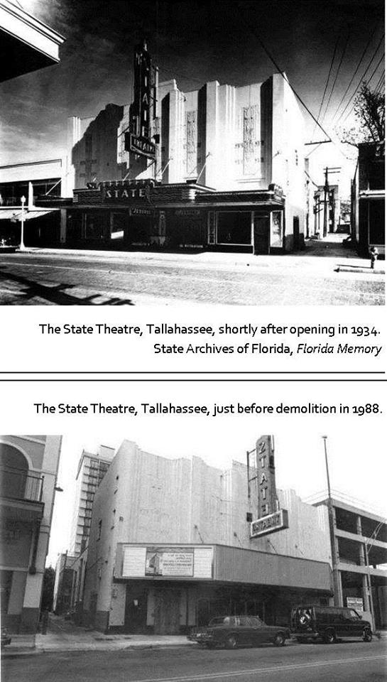 1988 – The State Theatre, located on the north side of College Avenue between Monroe and Adams in Tallahassee, was demolished on this date. The theatre opened in 1934 and closed in 1971. The building was designed in Art Deco style, including a stylish marquee that reached across the entire front of the building, five sculpted panels on the facade, and a two-story tall vertical sign. It was actually the Second state theater on this site (the first burned down) and was built for the Sparks Theatres chains.