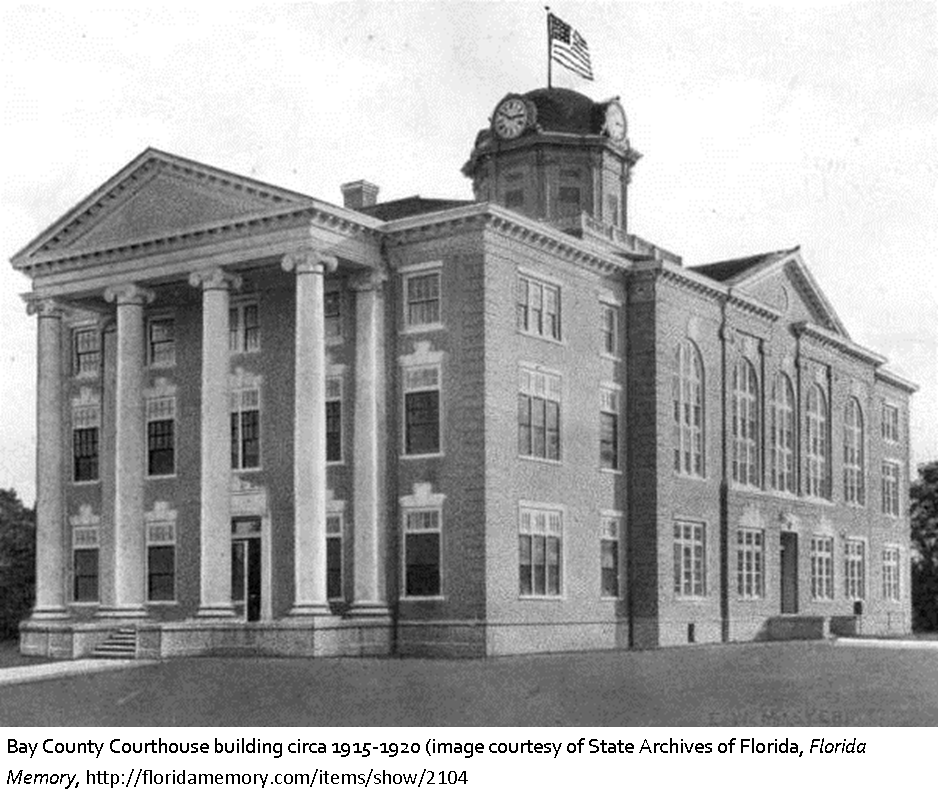 Construction began on the impressive Bay County courthouse building in Panama City on this date. Completed in 1915, the courthouse featured a large central clock tower and elaborate gabled roof. Unfortunately in 1920 the entire building burned to the ground and a new, simpler Classical Revival design was constructed in its place, which exists today. The courthouse became well known in 1961 when it convicted Clarence Earl Gideon of felony theft and refused to provide him with legal representation, a decision famously overturned by the U.S. Supreme Court in the case Gideon v. Wainwright in 1963. The building is still utilized as a courthouse, one of only a few in the state built during this period that is still used in that capacity.