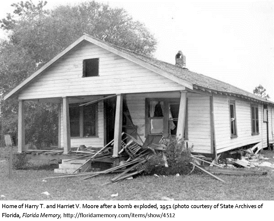 A bomb exploded under the home of pioneering civil rights activists Harry T. and his wife Harriette V. Moore in Mims, fatally wounding the two. Harry T. Moore became a field officer for the NAACP and the group’s president in 1941 where he helped registered tens of thousands of African American voters. Harry Moore, a school administrator in Brevard County, and Harriette V. Moore, a school teacher, lost their jobs in the county when they advocated an end to educational segregation and equal pay for African-American teachers. The most immediate, though unproven, cause for the bombing is thought to be a Ku Klux Klan response to a series of letters Harry Moore wrote to state and Federal officials calling for an investigation into the deaths of four African American prisoners in Lake County. The Moore Memorial Park and Cultural Center in Mims features a replica of their house and allows visitors to explore the history of the modern Civil Rights Movement and its effect on large and small communities and helps to preserve the memory of the Moores.