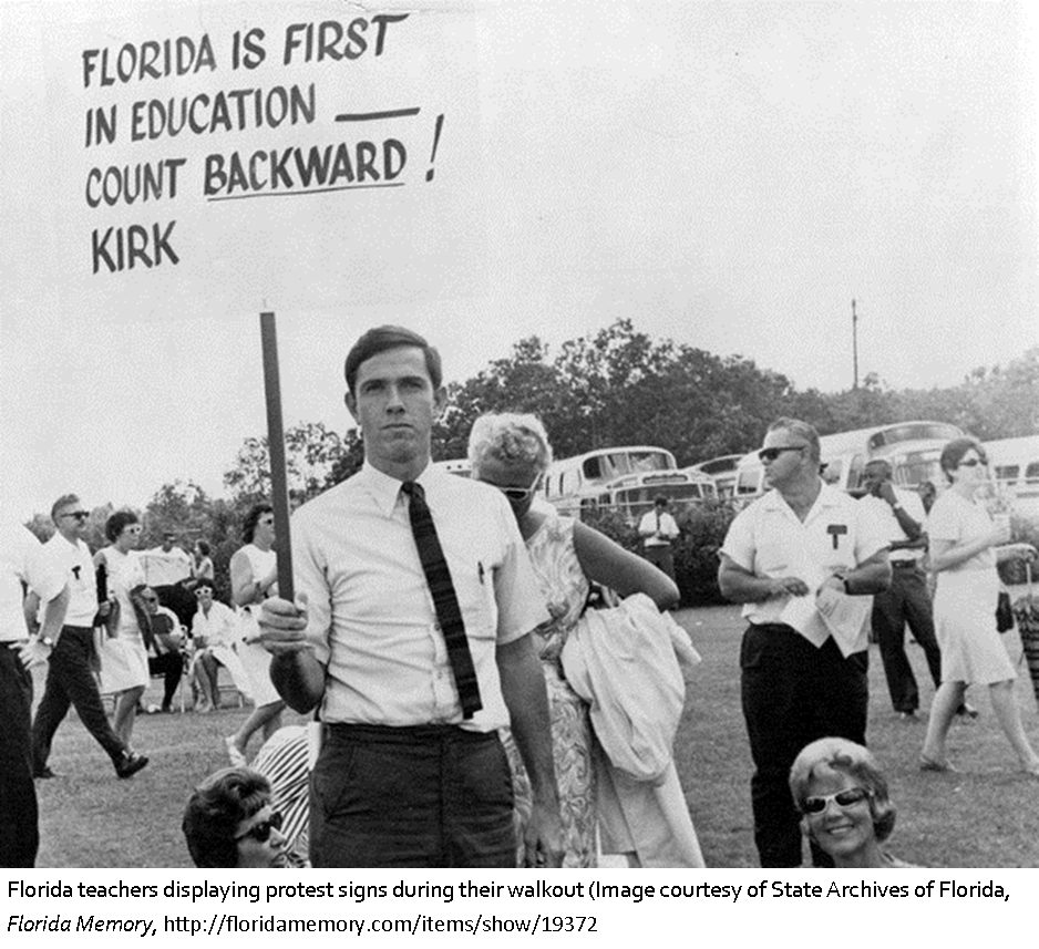 1968 - More than 27,000 teachers did not show up to work, forcing numerous schools to close because of a lack of instructors. The cause of the strike was under-funding of the state's educational system at a time when attendance was rising sharply, and low pay and benefits for teachers. The strike lasted from a few days in some school districts to three months in others. Although a special session of the Florida Legislature approved higher taxes to pay for more school funding, FEA members felt the funding hikes were not enough and voted to continue striking. No additional funding was forthcoming, however, and most local affiliates of the FEA settled their contracts and went back to work by March. This strike is considered the first statewide teachers' strike in United States history.