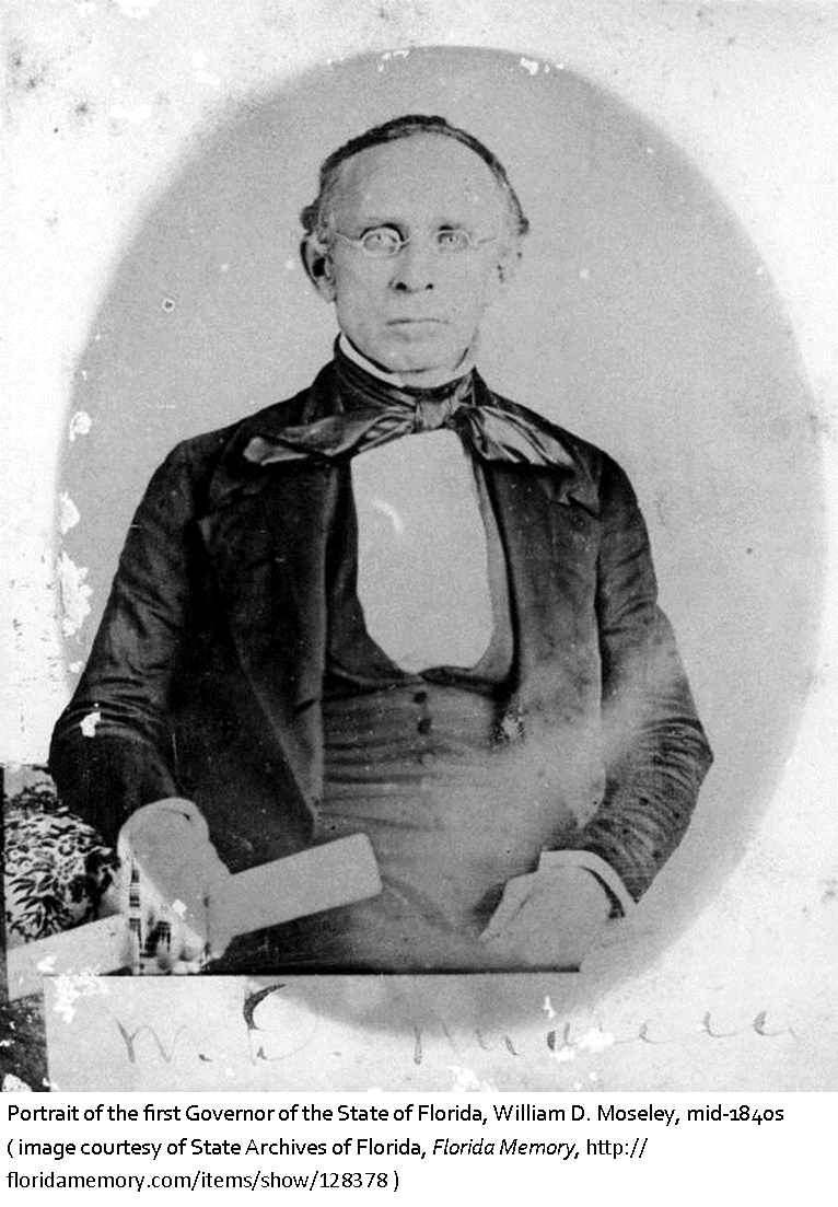 1863 - William Dunn Moseley, Florida’s first governor under statehood (1845-1849), died on this date. Moseley was born at Moseley Hall, Lenoir County, North Carolina, on February 1, 1795. He attended the University of North Carolina with such notables as James K. Polk, later president of the United States. After college, he practiced law in Wilmington, North Carolina, and entered public service as a state senator. He was defeated in the North Carolina gubernatorial race of 1834. In 1835, Moseley purchased a plantation in Jefferson County, Florida, and resided there until 1851. A member of the Territorial Legislature, Moseley defeated Richard Keith Call, the third and fifth Territorial governor of Florida, in the contest to become the first governor of the new state of Florida. In 1851, Moseley moved to Palatka, where he was a planter and fruit grower. He is buried at the West View Cemetery in Palatka.