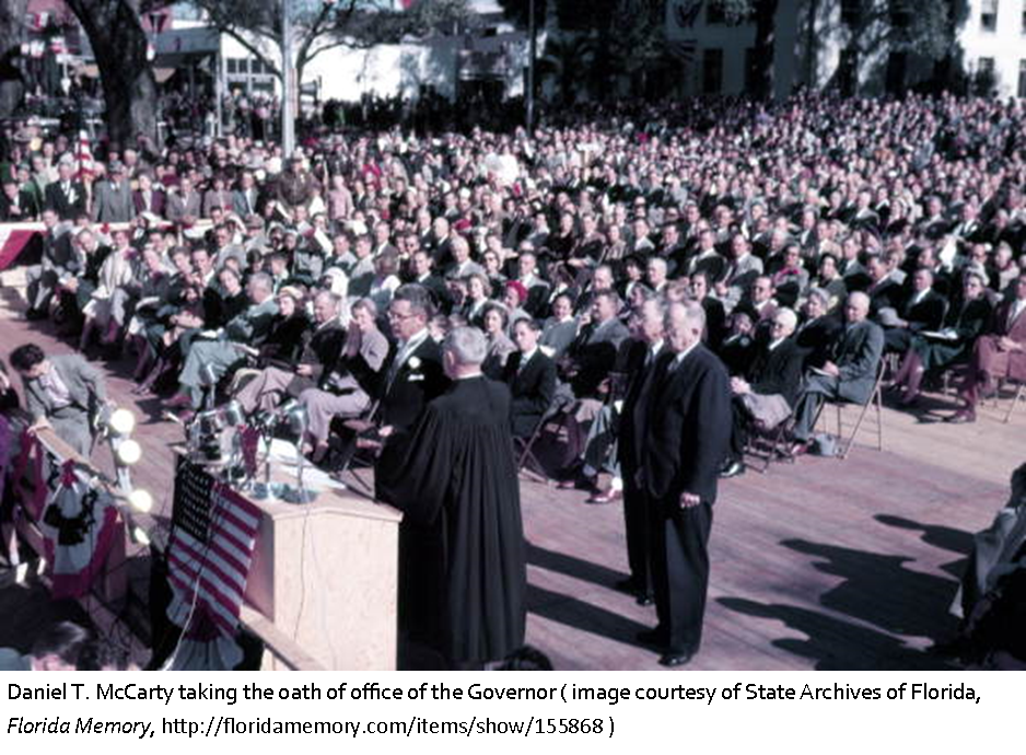 1953 – Daniel T. McCarty, Florida’s 31st governor was inaugurated on this date. McCarty was born to a wealthy family in Fort Pierce on January 18, 1912. He attended the University of Florida and later joined the U.S. Army during WWII, achieving the rank of colonel. Before being elected governor, McCarty was a citrus grower and cattleman, as well as a member of the Florida House of Representatives. As governor, McCarty raised teacher pay, established state scholarships for Florida’s teachers, and helped establish state funded aid programs for the disabled. Unfortunately though, after less than a year in office, Governor McCarty suffered a sudden heart attack and died on September 28th. He was buried near his boyhood home in Fort Pierce at the Palms Cemetery.