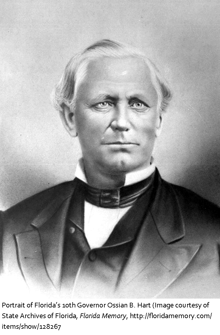 1821 – Ossian B. Hart, Florida’s first governor native to the state was born in Jacksonville on this date. His father Isaiah Hart was one of the founders of the city of Jacksonville and they lived on a plantation on the banks of St. Johns River. He served in the Florida House of Representatives and held a seat on the Florida Supreme Court before being elected the state’s 10th governor on January 7th, 1873. Shortly after being elected however, Hart fell ill and died in Jacksonville on March 18th, 1874. He is interred at the Evergreen Cemetery in Jacksonville.