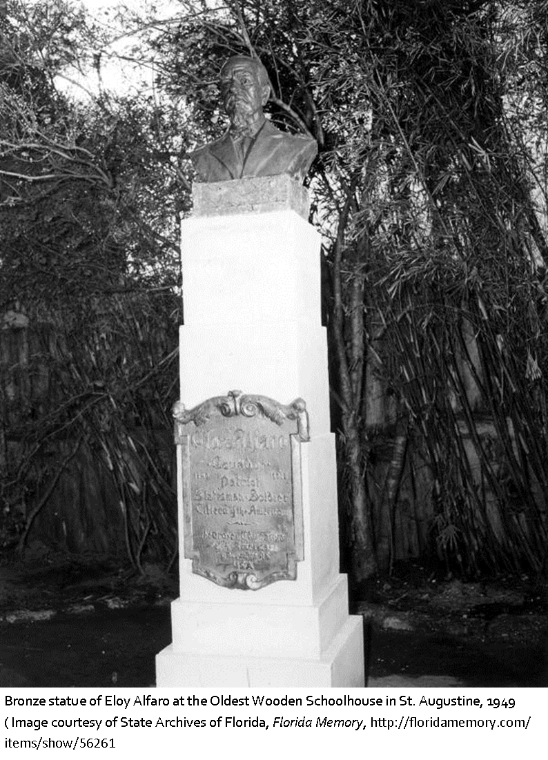 1949 – Dozens of foreign and domestic diplomats and dignitaries met in St. Augustine for the dedication of a bronze statue to Eloy Alfaro near the Oldest Wooden Schoolhouse Museum on this date. Alfaro served as President of Ecuador from 1895-1901 and from 1906-1911. He was known as a champion of free public schools for all Ecuadorians and was honored with the bronze statue by the Oldest Wooden House Museum because of this commitment to education. In attendance at the dedication ceremony was Eloy’s son and Ecuadorian Ambassador to the U.S. Eloy Alfaro Jr., as well as Florida State Senator Walter B. Frazer.