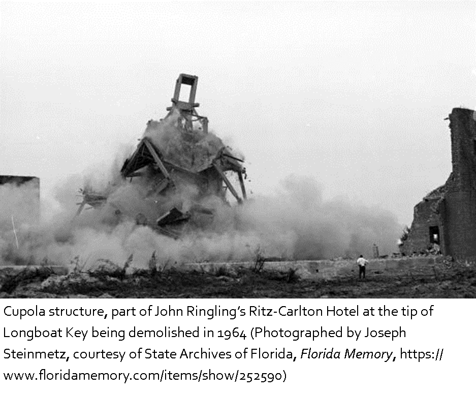 1964 - The imposing Ringling Ritz-Carlton Hotel on Longboat was finally demolished on this date. John Ringling first moved to Sarasota on Florida's southwest coast in 1912 andin earnest developing the sleepy Florida town. One such project was a large luxury hotel which Ringling planned to be a part of the Ritz-Carlton franchise. Not long after construction began in 1926, the project ran into financial trouble and with the onset of the Great Depression the hotel was abandoned unfinished. For decades it sat empty at the tip of Longboat Key until finally purchased for a new resort and the crumbling remains were torn down.