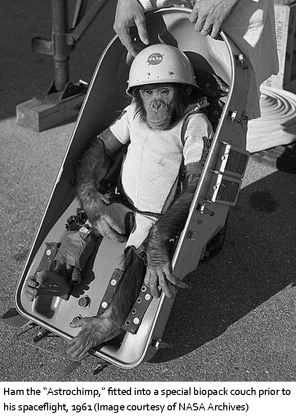1961 - Ham, America's first Astrochimp, was launched into space in an 18 minute flight aboard a Mercury capsule that reached an altitude of 150 miles from Cape Canaveral on this date. Ham?s flight in the Mercury capsule was a preliminary test before the launching of a human into orbit later that year. After his first and only flight, Ham spent the next 17 years at the National Zoo in Washington D.C. and later the North Carolina Zoo.