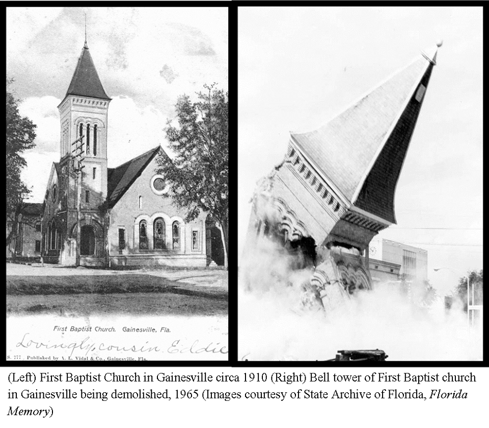 1965 – The First Baptist Church of Gainesville was demolished on this date. Founded in 1831 as the Shiloh Baptist Church, it grew steadily over the course of the 19th century within a number of wooden structures until August 29, 1909 when a new brick structure was dedicated. The new church featured wooden pews arranged in a semicircle around the pulpit and a large stone bell tower. In 1936 a devastating tornado swept through downtown Gainesville damaging the church, but it was soon repaired and back open to parishioners. On February 12th, 1960 however, a devastating fire destroyed the church beyond repair and it was completely demolished in 1965.