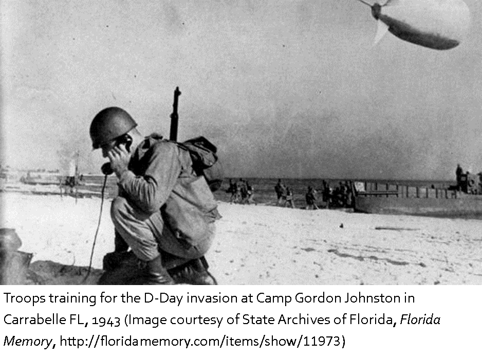 1944 – Thousands of Floridians and men who had trained in Florida took part in the largest amphibious military operation in human history on the Normandy coast of France on this date. Over 150,000 allied troops participated in what was nicknamed Operation Overlord. Many Americans trained for the amphibious landing at Florida bases including Camp Gordon Johnston, and Camp Blanding, as well as a number of Naval Air Stations, Army Air Fields and Naval bases. By 1942 there were more than 170 military facilities in Florida. Although the invasion was a success, thousands of soldiers lost their lives on the beaches of Normandy and the war in Europe dragged on for another year until ultimate victory was declared on May 8th, 1945.