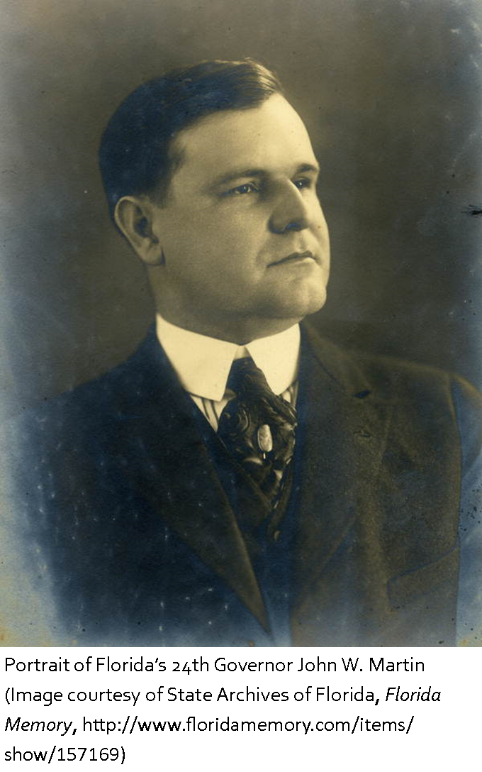 1884 – John Wellborn Martin, the 24th Governor of Florida (1925-1929) was born in Plainfield in Marion County on this date. Martin passed the bar in 1914 and began practicing law in Jacksonville soon after. He was elected Mayor of Jacksonville in 1917 and served until 1923. He was sworn in as Governor on January 6, 1925 and focused much of his work on building new roads and infrastructure in the growing state, as well as expanding state-funded public schools. After leaving office he ran unsuccessfully for a seat in the U.S. Senate and died in Jacksonville in 1958.