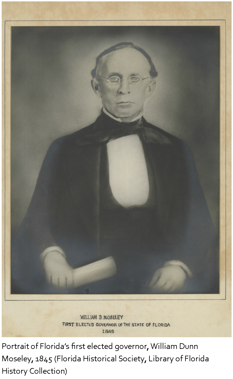 1845 – William Dunn Moseley was sworn in as the first Governor of the State of Florida on this date. Born in Lenoir County North Carolina in 1795, Moseley graduated from the University of North Carolina Chapel Hill in 1818 and received a Master’s degree in 1821. He served in the North Carolina Senate from 1829-1832 before moving to Jefferson County Florida in 1835. Moseley served in the both the territorial House and Senate before winning the hotly contested 1845 gubernatorial race against former territorial governor and popular Florida politician Richard Keith Call. As governor, he supported the expansion of agricultural endeavors and state funded public schools. He served only one term as governor then moved to Palatka in 1851 where he operated a citrus plantation until his death in 1863.