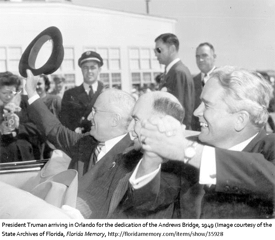 1948 – President Harry S. Truman attended the dedication ceremony of the Charles O. Andrews causeway crowing Lake Estelle in Orlando. Andrews represented Florida in the U.S. Senate from 1936 until his death in 1946. Andrews was born in Ponce de Leon on March 7th 1877 and graduated from the University of Florida in 1907 and studied law. Andrews had also served in the Florida Militia during the Spanish American War.