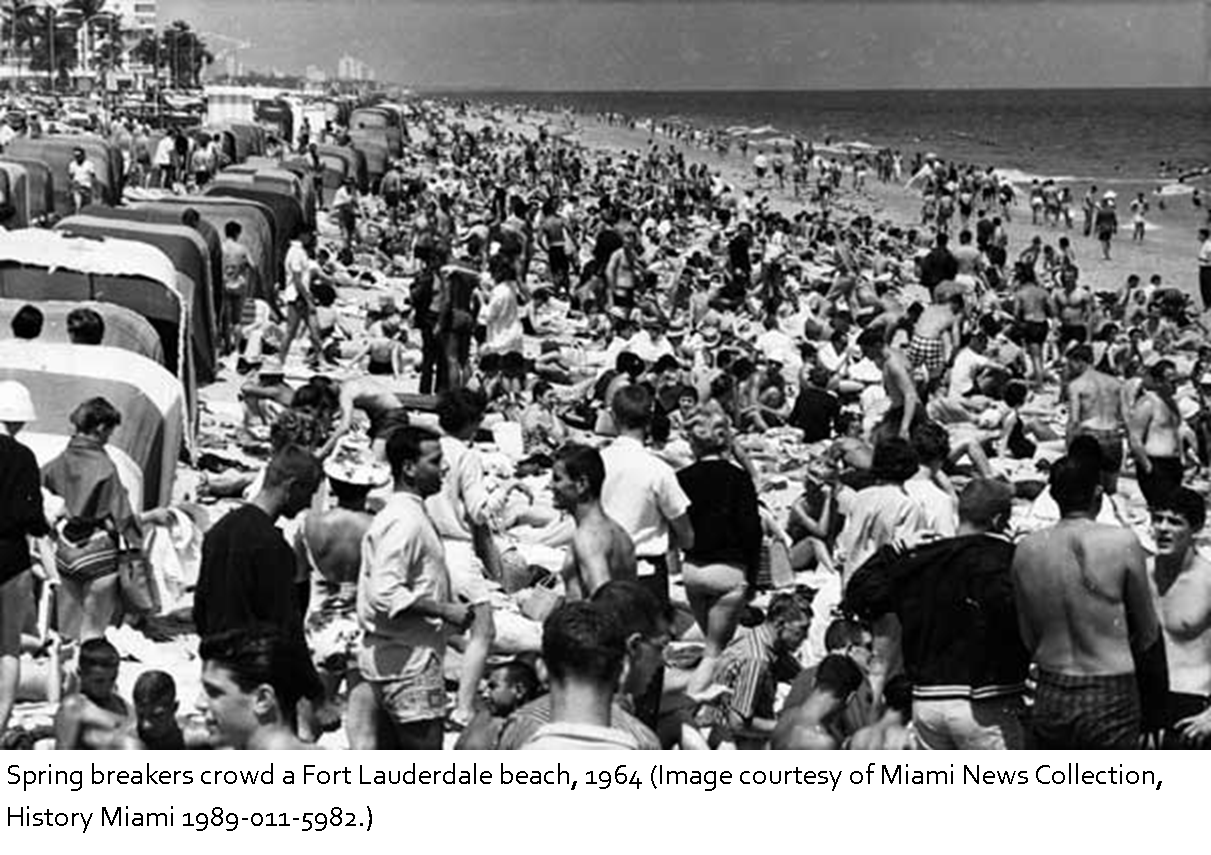 1967- A three-day riot pitting collegians against police during Spring Break began in Fort Lauderdale on this date. At least 500 people were arrested as a result. The riot was sparked when a student lay in the middle of A1A and the police got involved. By the 1960s, sun, beaches, and beer made south Florida THE destination for college students on Spring Break. The tradition began when the City of Fort Lauderdale began hosting dances during the seasonal spring break period. As one coed quoted in Time magazine explained, “It’s where the boys are.” The quote prompted a book and movie that put a winsome face on a seasonal influx of tourists who were becoming increasingly unwelcome in Fort Lauderdale.