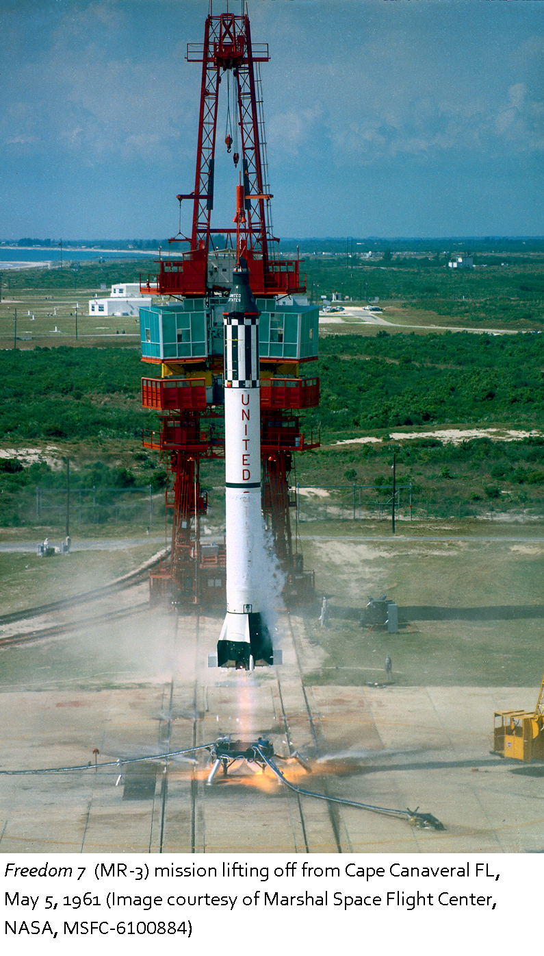 1961 – Alan Shepard became the second person and the first American in space on this date, lifting off from Cape Canaveral during the Freedom 7 mission aboard a Mercury Redstone rocket. The suborbital flight lasted only 15 minutes and traveled a downrange distance of 263.1 nautical miles. Shepard splashed down safely in the Atlantic near the Bahamas and was airlifted to an awaiting aircraft carrier.