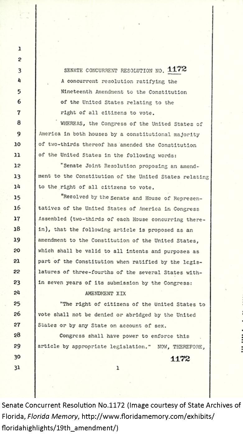 1969 – The Florida Legislature symbolically ratified the 19th amendment to the U.S. Constitution, granting women the right to vote on this date. Although Florida was not one of the states that moved to ratify the 19th amendment back in 1919/1920, the state did pass a law granting all residents suffrage in 1921. Senate Concurrent Resolution No.1172 was passed easily by the State House and Senate and was signed by Governor Claude Kirk on May 22nd.