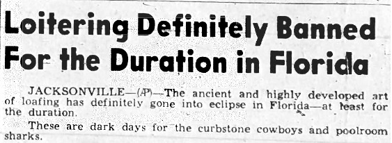 In light of a war-time need for employment during World War II, Florida bans loitering and joblessness. Police officers are told to check “jook joints” and arrest men who cannot show proof of employment. Orlando Chief of Police J. C. Stone said, “If a man wants a job he can get in on our groves, on our farms, or in defense construction. The time has come to clean Orlando of its loitering and idle me who are contributing less than nothing to the war effort.”