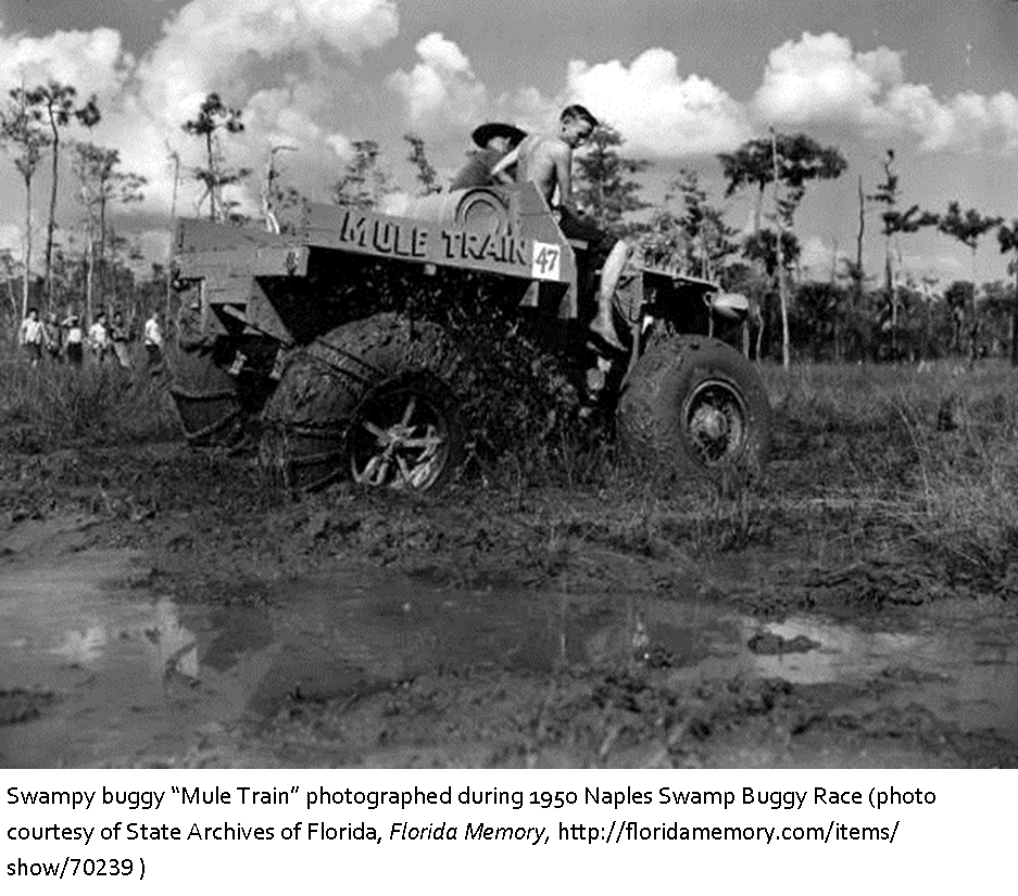 The second annual Naples Swamp Buggy Race was held on this date. Invented by Naples resident Ed Frank and used throughout the Everglades and much of south Florida during the 1930s and 1940s, the swamp buggy proved to be an invaluable companion for early south Florida developers, hunters, and anyone aiming to travel through south Florida’s swamps. The buggies are generally custom built from the ground up, or heavily modified stock vehicles. Early races began in the mid-1940’s as local “gladesmen” began racing each other for fun, but by 1949 the first official swamp buggy race was held in Naples; a tradition that continues today.