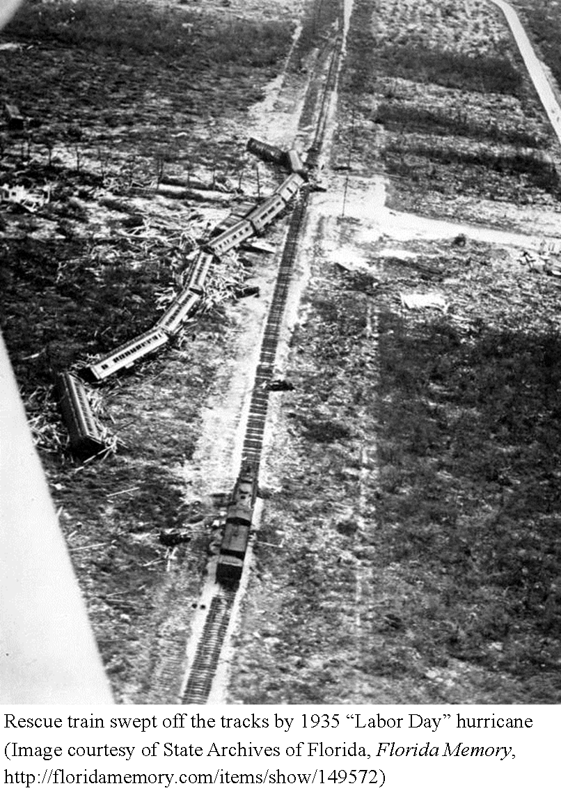 The infamous “Labor Day” hurricane made landfall near Craig Key in the Florida Keys on this date. It was the third most intense Atlantic hurricane on record, making landfall as a Category 5 storm with winds exceeding 156 mph. A 10-car evacuation train sent from Homestead carrying many WWI veterans who had been working in the Keys with the Civilian Conservation Corps was swept off the tracks by storm surge on Upper Matecumbe Key, killing many of them. Nearly 500 deaths were attributed to the storm, although the actual number was probably much higher. Much of Henry Flagler’s Florida East Coast Overseas Railway was destroyed by the storm and never rebuilt. Author Ernest Hemingway visited the veterans’ camps shortly after the storm and wrote an article entitled, “Who Killed the Vet,” which placed the blame on the government for sending the workers to the Keys during hurricane season. A monument to those killed in the storm was erected in Islamorada and unveiled in 1937.