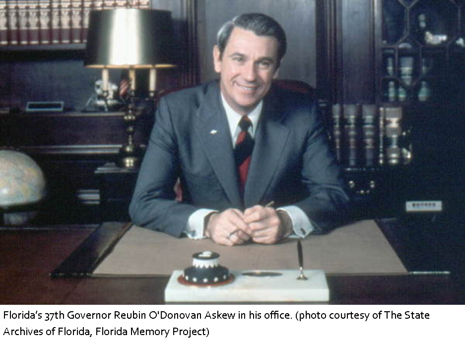 1928 – Rueben O’Donovan Askew, the 37th Governor of Florida was born on this date in Muskogee Oklahoma. Askew moved to Escambia County in 1930s and attended Pensacola High School. He graduated from both The University of Florida and Florida State University and served in both the Florida House of Representatives and the Florida Senate before being elected Governor in 1971. Askew served two consecutive terms in office (1971-1979), and his governorship was known for its stance on racial justice, capital punishment, and tax reform.