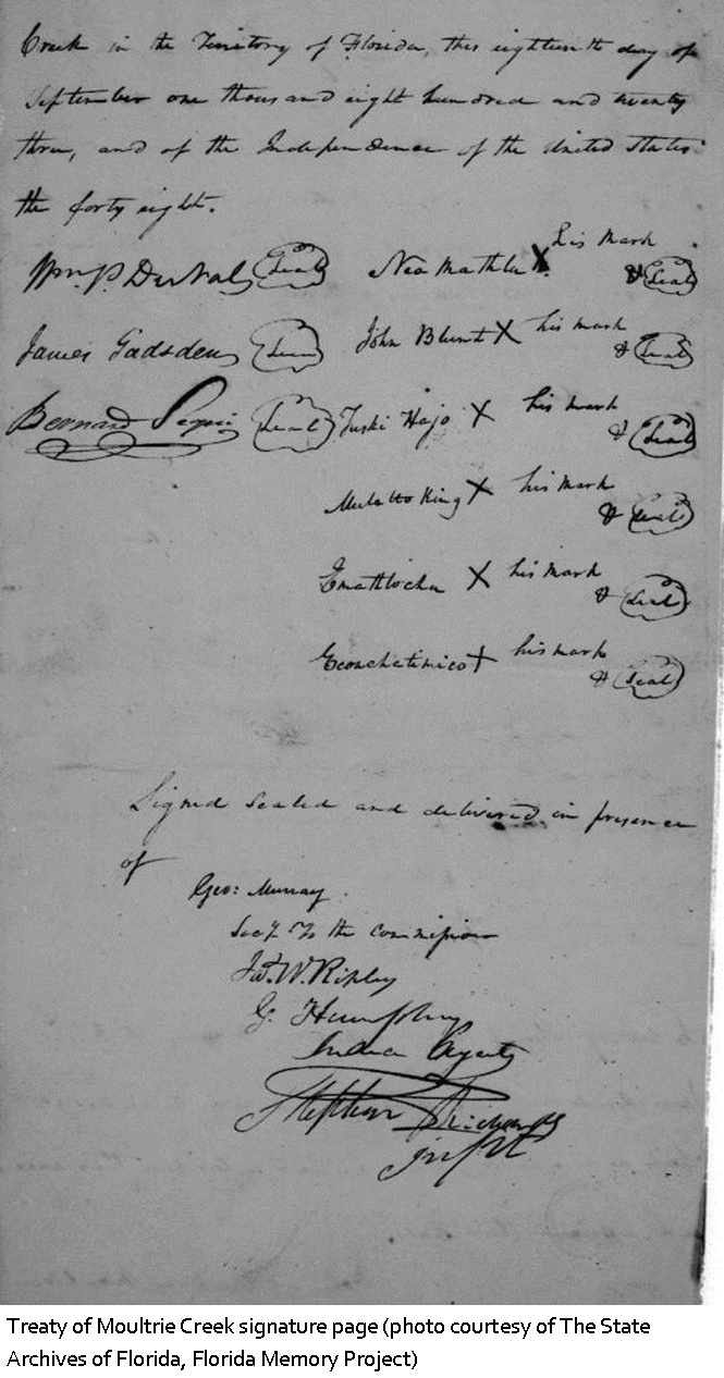 1823 – The Treaty of Moultrie Creek was signed on this date between the Seminole Indians and the U.S. government as a result of the U.S. acquisition of Florida two years earlier. Terms stipulated in the treaty included the concentration of the Seminoles onto a reservation in central Florida, thus relinquishing all other lands to the U.S., and also the promise by the Seminoles to apprehend all slaves and other fugitives found in this new reservation. The Indians were promised farming implements and funds to help develop this new land. Governor William Duval was present for the signing, as well as James Gadsden, appointed especially for the task of negotiation with the Seminoles. Over 400 Seminole Indians arrived from around the state for the treaty negotiations. Terms of the treaty were not fully upheld on either side however, and The Second Seminole War broke out in 1835.
