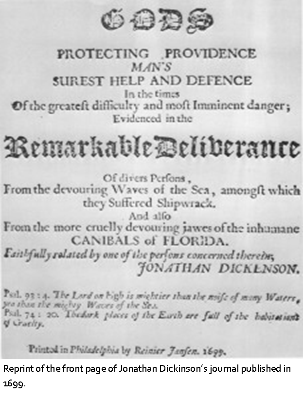 The ship Reformation wrecked off of the east coast of Florida near resent day Hobe Sound on this date. Onboard was a Quaker merchant traveling from Port Royal Jamaica to Philadelphia with his family named Jonathan Dickinson. The shipwrecked survivors were harassed and at times held captive by some of the Native American tribes including the Ais and the Jaega. Dickinson and the surviving members of their party traveled north along the undeveloped east coast of Florida finally reaching Spanish St. Augustine on November 15th. The Spanish then helped the party travel north to Charleston South Carolina and from there to Philadelphia. Dickinson wrote a journal of his ordeal as a castaway and captive which was first published in 1699 as God’s Protecting Providence. It is one of the earliest detailed accounts of Native American life in this part of Florida during the late 17th century and continues to be a resource for both historians and anthropologists. The book is still in print today and is often referred to simply as Dickinson’s Journal. The State of Florida dedicated a park near the shipwreck site in Martin County after Dickinson which opened in 1950.
