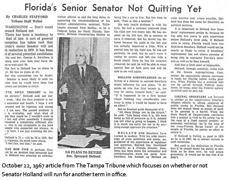 Former Governor of Florida Spessard L. Holland assumed the U.S. Senate seat vacated by Charles O. Andrews of Ponce de Leon, FL on this date. Holland had previously served as the 28th Governor of Florida from 1941-1945. Holland would be elected to the U.S. Senate another four terms before retiring from politics in 1970. Lawton Chiles succeeded Holland after Chiles’ famous walk through the state.