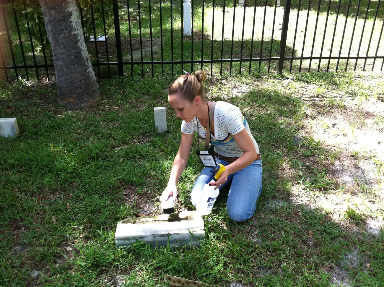 Photo 2 caption: A volunteer uses “best practices” to clean a headstone in the Houston Family Cemetery in Eau Gallie.