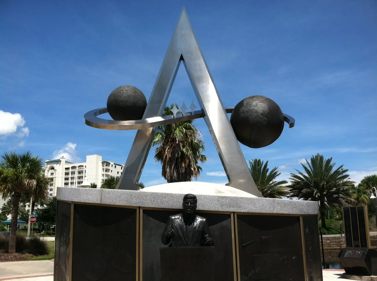 It took longer to conceptualize, design, and create the elaborate Apollo monument than it did to bring President Kennedy’s dream of landing a man on the moon to fruition. The monument consists of a huge stainless steel “A” encircled by a bronze earth and moon, 12 bronze panels telling the Apollo program story, and a life-size statue of John F. Kennedy at a podium. Lining the walkway around the monument are pylons featuring the names and hand prints of all the Apollo astronauts.