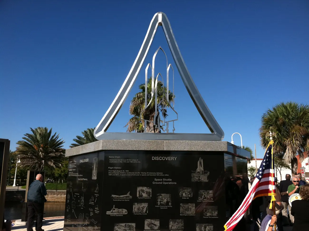 The U.S. Space Walk of Fame in Titusville led efforts to create a large monument to the shuttle program. The $350,000 structure joins other monuments to NASA programs in Space View Park. Six black granite panels are engraved with images and text describing the shuttle program. An 8-ton steel outline of the shuttle on top of the panels points toward the sky.