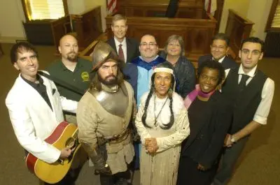 The Florida Historical Society staged the original courtroom drama “Ponce de León Landed HERE!!” to present the available information in an entertaining way. The performance that can be seen online was recorded at the Historic Volusia County Courthouse on January 12, 2013. An audience in Tallahassee watched the proceedings in DeLand “live” as they were projected on a screen at the Museum of Florida History.
