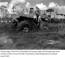 The second annual Naples Swamp Buggy Race was held on this date. Invented by Naples resident Ed Frank and used throughout the Everglades and much of south Florida during the 1930s and 1940s, the swamp buggy proved to be an invaluable companion for early south Florida developers, hunters, and anyone aiming to travel through south Florida’s swamps. The buggies are generally custom built from the ground up, or heavily modified stock vehicles.