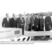 The current Alvin G. Shands Bridge was dedicated on this date. The two lane steal stringer beam-type bridge spans the St. John’s River connecting Orangdale on the eastern shore of the river with Green Cove Springs on the western shore; a total span of 6662 ft. Until the opening of the I-295 Henry Holland Buckman Bridge in 1970, the Shands Bridge was the only crossing between Jacksonville and Palatka.