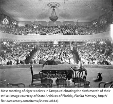 Cigar workers in Tampa, having been on strike for 6 months, called a workers’ meeting and voted in favor of continuing the strike. The Tampa Tribune reported on the meeting and called closed shops “un-American”. When the strike ended 4 months later, it had been the longest and most expensive in the Tampa cigar industry.