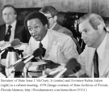 1978 - Jesse J. McCrary, Jr. was sworn in as Florida’s Secretary of State on this date, the first African American to occupy that post since Reconstruction. McCrary was born in Blitchton, Marion County in 1937 and graduated from Florida A&M with his Juris Doctor in 1965. He worked as Florida’s assistant Attorney General and in 1970 became the first black lawyer from a southern state to argue a case in front of the U.S. Supreme Court. From his time at FAMU to his final years living in Miami, McCrary was an advocate for civil rights in Florida.