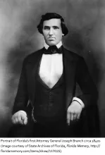 1845 – Joseph Branch became the first Attorney General for Florida on this date. Branch had worked as a lawyer in Tallahassee in the 1830s and early 1840s where he represented individuals and businesses such as the Southern Life Insurance Company. The office was originally created by the 1838 State Constitution and was elected by the state Legislature. In 1868 it became a popularly elected office, which it still is today. Branch ended his term as Attorney General on July 14th, 1846.