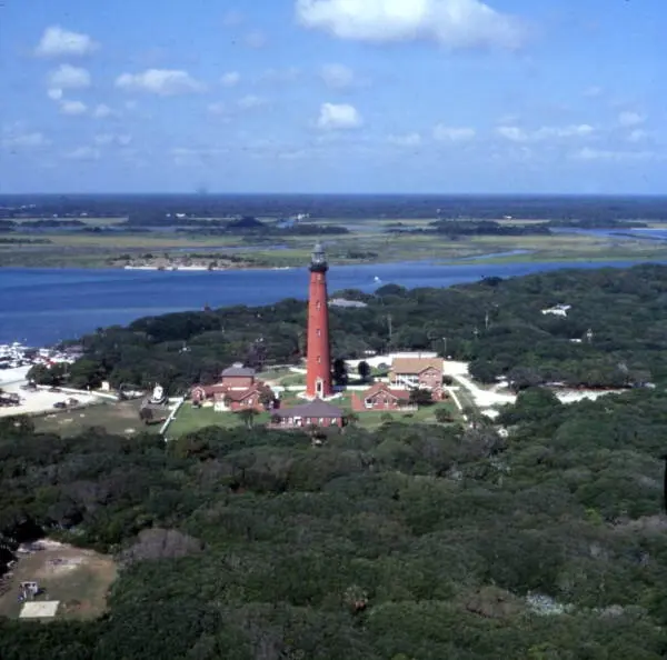 Ponce de León Inlet, popularly known as Ponce Inlet, was known as Mosquito Inlet when the red brick lighthouse was first constructed in 1835. When the Second Seminole War started later that year, the lighthouse was attacked before the lamp could be lit. The Seminoles destroyed the glass lantern and burned the structure’s wooden stairs. The threat of further attacks prevented repairs from being made, and the lighthouse collapsed in 1836.