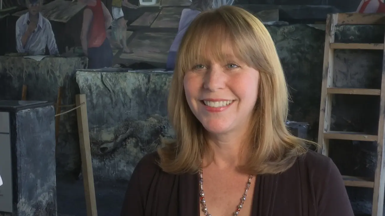 Patrisha Meyers is director of the Florida Historical Society Archaeological Institute at the Brevard Museum of History and Natural Science. Meyers points to an artifact on display at the museum in the People of Windover exhibit.