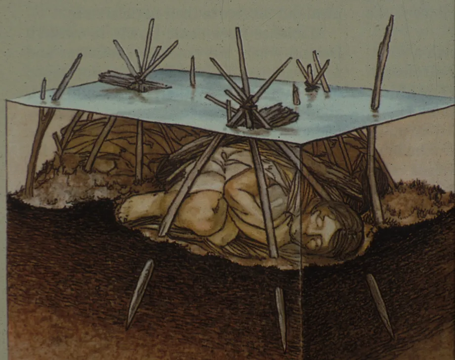 Nearly 200 separate, intact burials were excavated at the Windover site. With only a couple of exceptions, the bodies had been ritualistically buried and placed in the same fetal position, lying on the left side. The heads were pointed west, with their faces to the north. The deceased were wrapped in what archaeologists believe is the oldest existing woven fabric in the world. Several branches were lashed together to form a tripod that held each body submerged underwater, creating a pond cemetery.